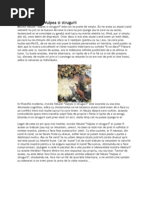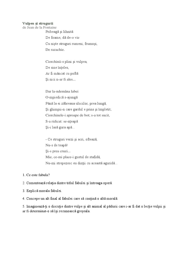 Vulpea şi strugurii jean de la fontaine. Ea ne arata ca atunci cand oamenii nu pot sa se bucure de ceva la care nu pot ajunge sau la care nu au acces incearcand sa se consoleze cu gandul acel lucru nu merita atentia lor fiind pur si simplu zic ei ceva demn de dispretuit. Vulpea si strugurii rezolvă testul vulpea si strugurii pe platforma educațională kidibot.